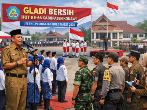HeadlineKONAWE, FAKTA1.COM –- Pemerintah Kabupaten Konawe menggelar gladi bersih menjelang peringatan Hari Ulang Tahun (HUT) ke-66 Kabupaten Konawe yang akan dipusatkan pada 3 Maret 2026. Kegiatan tersebut berlangsung di halaman Kantor Bupati Konawe, Minggu (1/3/2026). Sekretaris Daerah (Sekda) Kabupaten Konawe, Dr. Ferdinand Sapan, S.P., M.H., mengatakan gladi bersih dilakukan untuk memastikan seluruh rangkaian acara puncak […]