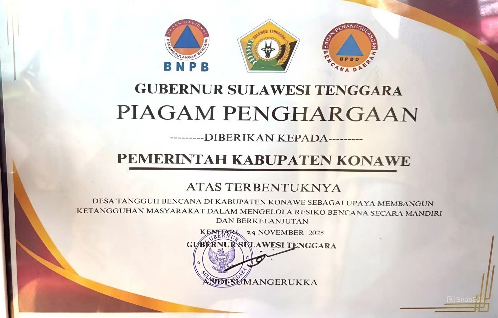 Penghargaan tersebut diberikan setelah Konawe dinilai berhasil membangun pola mitigasi bencana berbasis komunitas yang dinilai efektif dan berkelanjutan. Program Destana yang diterapkan selama beberapa tahun terakhir disebut mampu mendorong partisipasi aktif masyarakat dalam pengelolaan risiko bencana.