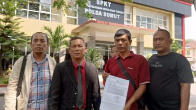 Teks foto : Suami korban (memegang surat) didampingi tim penasihat hukum saat di Mapolda Sumut.