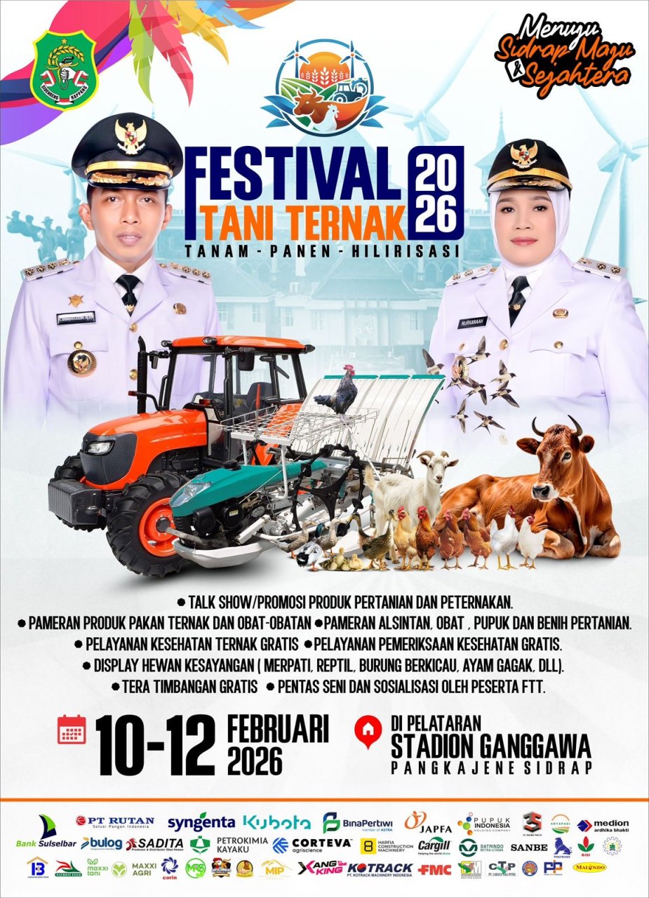 SIDRAP, FAKTA1.COM— Pemerintah Kabupaten Sidenreng Rappang (Sidrap) akan menggelar Festival Tani Ternak (FTT) 2026 sebagai ajang promosi dan penguatan sektor pertanian dan peternakan. Kegiatan ini dijadwalkan berlangsung 10–12 Februari 2026, di Pelataran Stadion Ganggawa, Pangkajene, Sidrap.