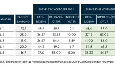 Pada survei bulan November, lanjut dia, selisih elektabilitas pasangan Bambang-Catur dan Hadi-Sugeng menjadi 22%. Sebaran elektabilitas berdasarkan daerah pemilihan DPRD Kab. Grobogan, pasangan Bambang-Catur unggul atas pasangan Hadi-Sugeng di seluruh daerah pemilihan.