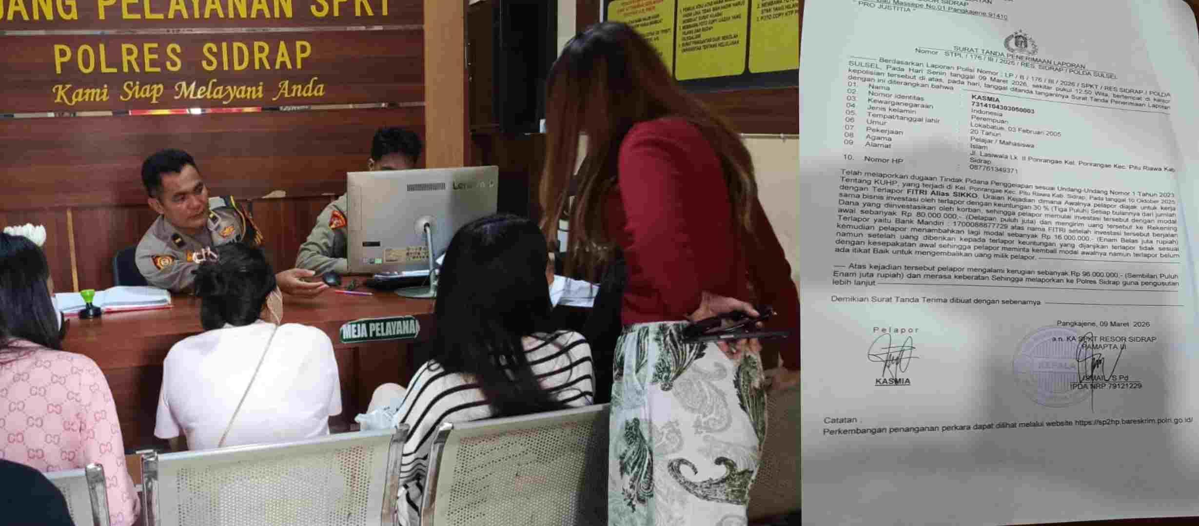 Laporan tersebut tercatat dalam Surat Tanda Penerimaan Laporan (STPL) yang diterbitkan oleh Polres Sidrap pada Maret 2026. Dua korban yang sudah melapor masing-masing bernama Marta T (34).