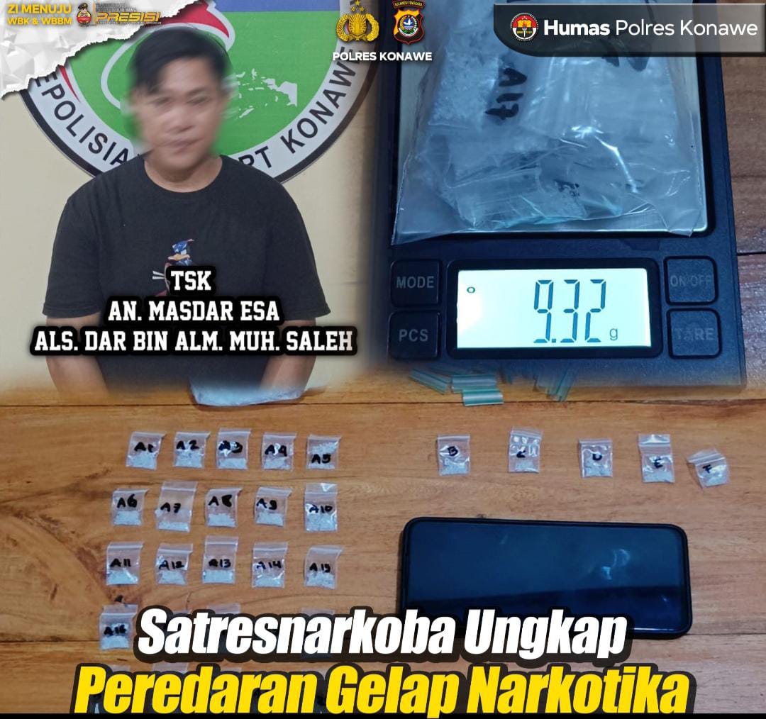 Masdar ditangkap aparat Satuan Reserse Narkoba Polres Konawe pada Kamis, 7 Agustus 2025, sekitar pukul 17.30 WITA di Desa Woworoda Jaya, Kecamatan Tongauna Utara. Dari tangannya, polisi menyita 31 paket sabu siap edar dengan berat bruto total 9,32 gram.