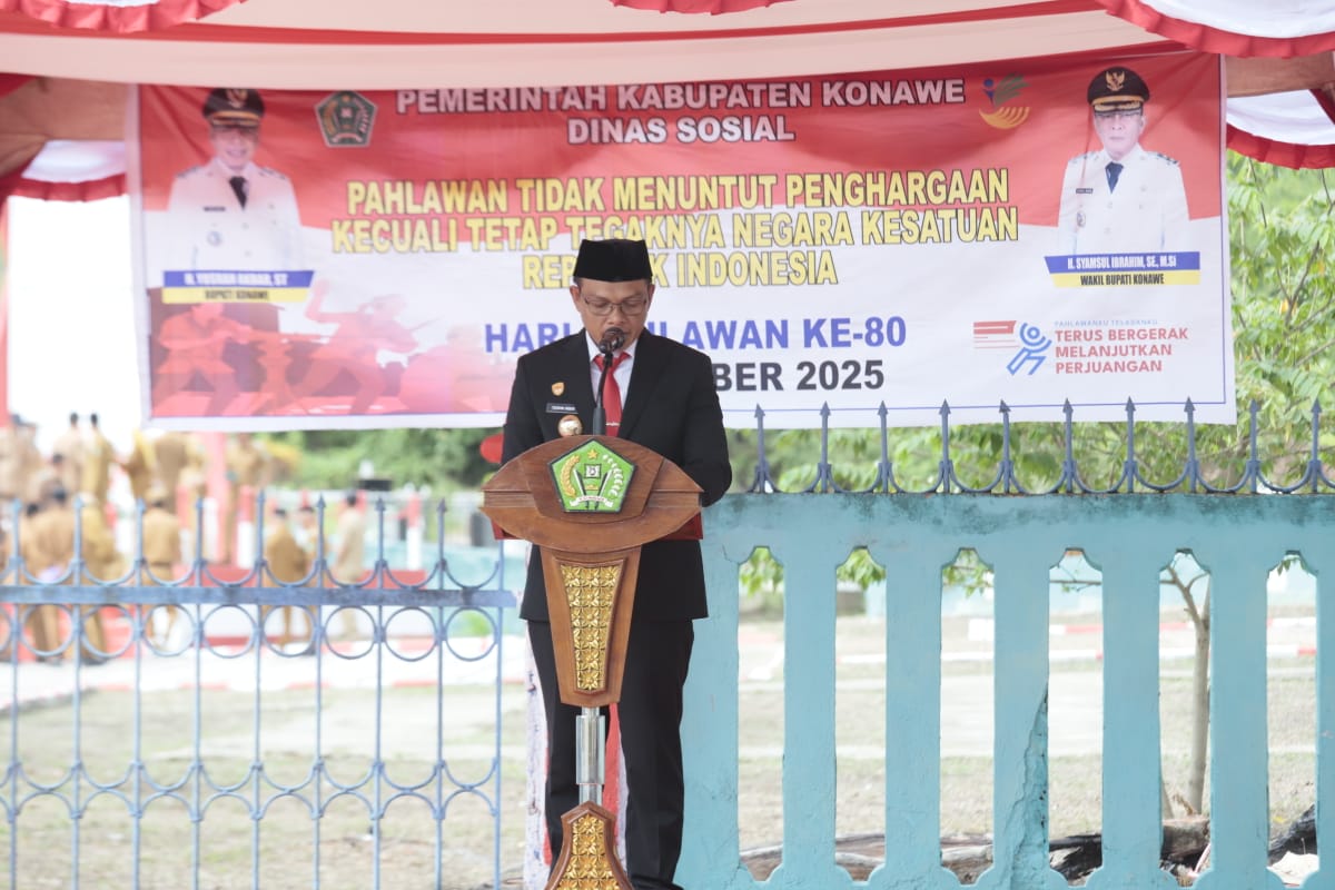 FAKTA1.COM, KONAWE— Bupati Konawe, Yusran Akbar, ST, memimpin upacara ziarah nasional dalam rangka memperingati Hari Pahlawan Nasional ke-66, bertempat di Taman Makam Pahlawan (TMP) Asao, Unaaha. Suasana khidmat menyelimuti seluruh peserta yang hadir, mulai dari jajaran Forkopimda, kepala OPD, perwakilan TNI–Polri, veteran pejuang, hingga pelajar dan berbagai elemen masyarakat. Senin 10 November 2025