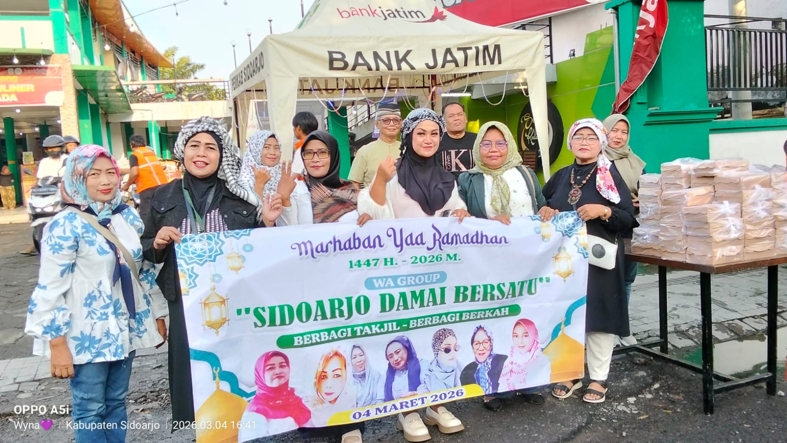 SIDOARJO -Persatuan Perempuan Sidoarjo yang tergabung dalam group medsos Sidoarjo Damai Bersatu berbagi takjil dan suarakan perdamaian untuk dua pimpinan di Sidoarjo yang berlangsung di depan Sentral Kuliner Gajah Mada, Rabu, 04/03/2026.