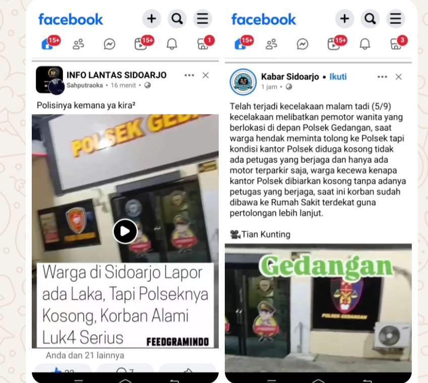 SIDOARJO -Sehubungan dengan adanya informasi atau postingan yang menyebutkan bahwa pelayanan di kantor Polsek Gedangan diduga kosong tidak ada petugas, informasi tersebut tidak benar, saat terjadi kecelakaan lalu lintas, anggota Polsek Gedangan merespon dan melayani korban di TKP, melakukan koordinasi dengan pihak ambulans, dan segera mengevakuasi korban ke rumah sakit agar mendapatkan pertolongan secepatnya.