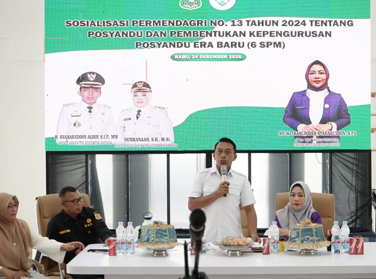 FAKTA1.COM– Ketua Tim Pembina Posyandu Kabupaten Sidenreng Rappang (Sidrap), Hj. Haslindah Syaharuddin, membuka Sosialisasi Peraturan Menteri Dalam Negeri Nomor 13 Tahun 2024 tentang Posyandu sekaligus Pembentukan Kepengurusan Posyandu Era Baru berbasis enam Standar Pelayanan Minimal (SPM), Rabu (24/12/2025).