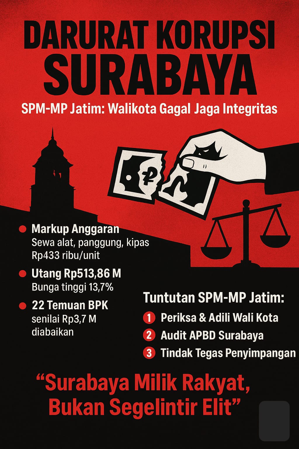 Dalam pernyataan resminya, A. Sholeh, Koordinator Aksi SPM-MP Jatim, menegaskan bahwa kondisi Surabaya kini masuk kategori darurat korupsi. Ia menuntut aparat penegak hukum (APH) segera memeriksa dan mengadili Wali Kota Surabaya.