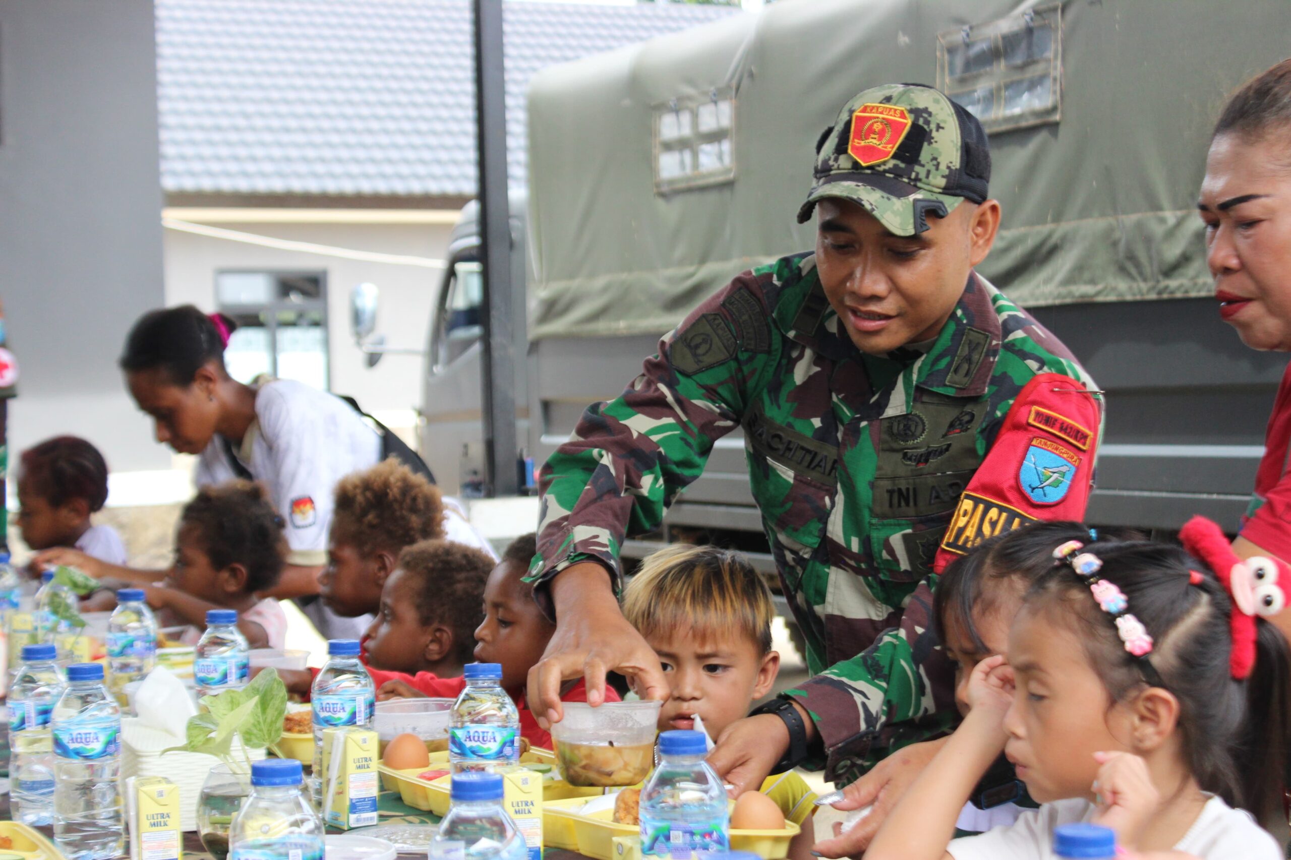Guna Menunjang Perbaikan Gizi Pada Anak Diwilayah Satgas Yonif 642/Kps,Pos Kout Tahota Bagi Makanan Bergizi