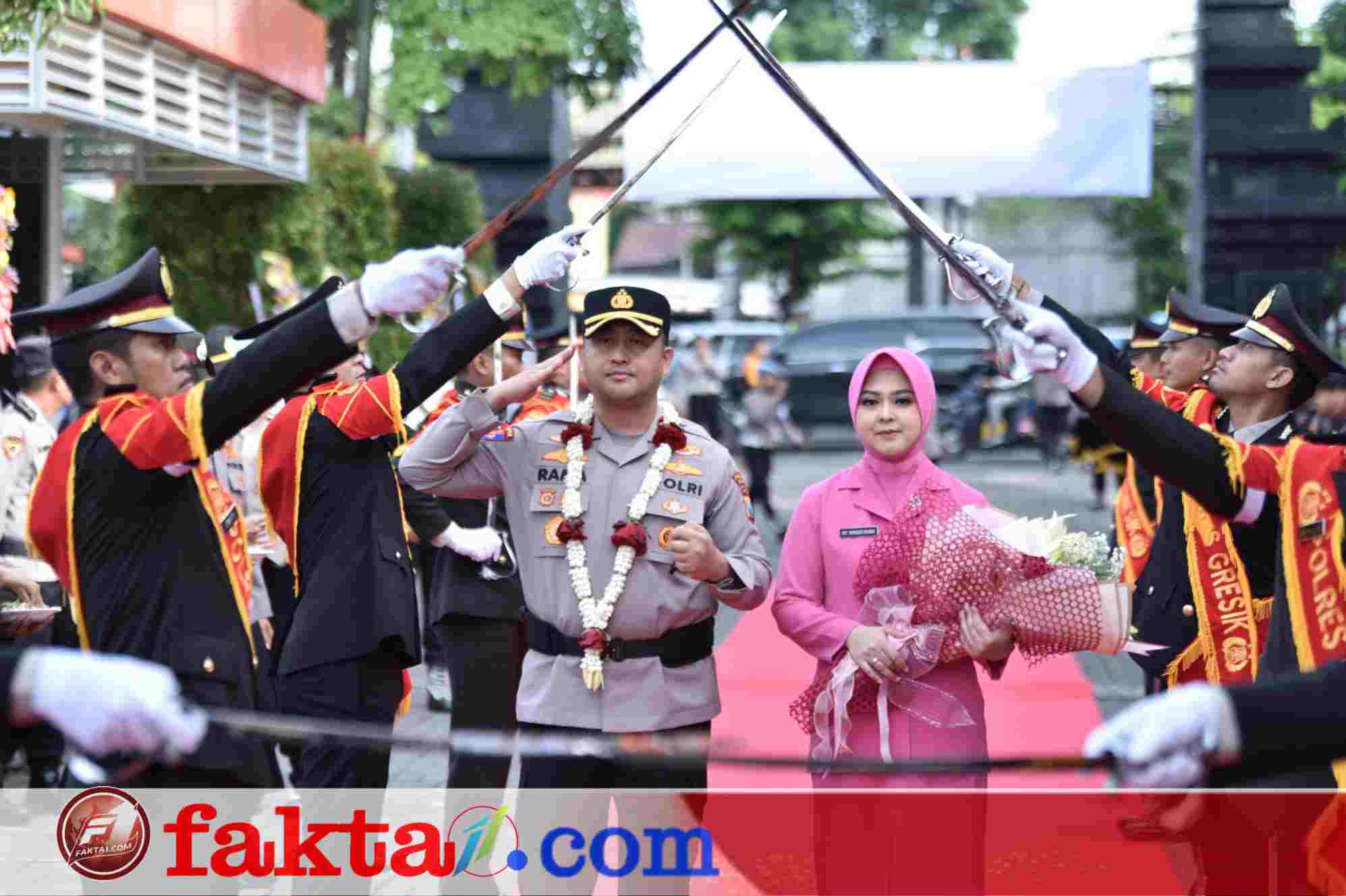 Barisan personel Polres Gresik memberikan penghormatan saat AKBP Ramadhan Nasution memasuki gerbang Mapolres. Prosesi berlanjut dengan tradisi gapura pedang pora, di mana perwira pertama membentuk barisan pedang sebagai jalan kehormatan bagi pejabat baru.