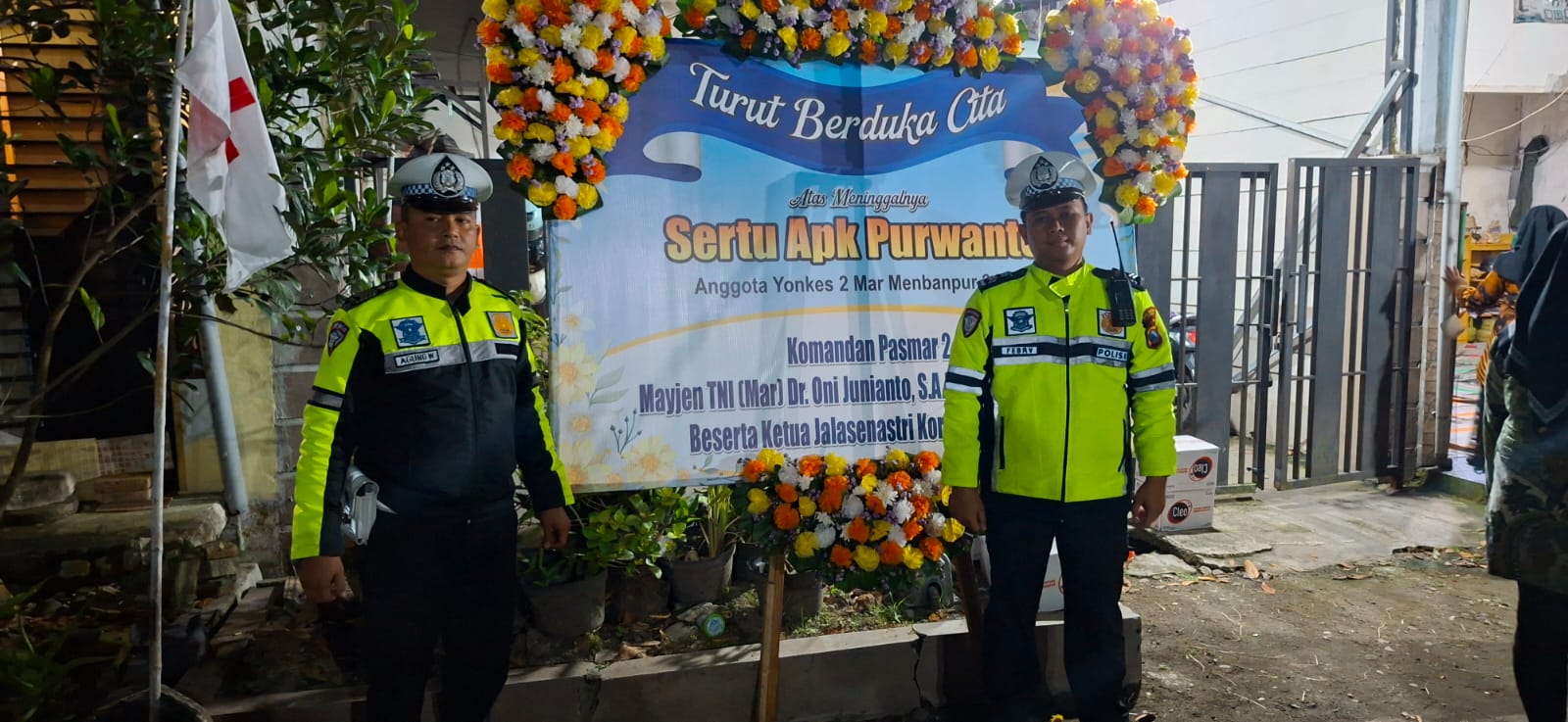 Sidoarjo-Jajaran Polsek Krian Polresta Sidoarjo melaksanakan pengamanan dan pengawalan prosesi pemakaman almarhum Sertu Purwanto, anggota Yonkes 2 Marinir Menbanpur 2 Mar Pasmar 2 Karangpilang, sebagai bentuk penghormatan terakhir sekaligus pelayanan humanis kepada masyarakat, Sabtu malam (24/1/2026).